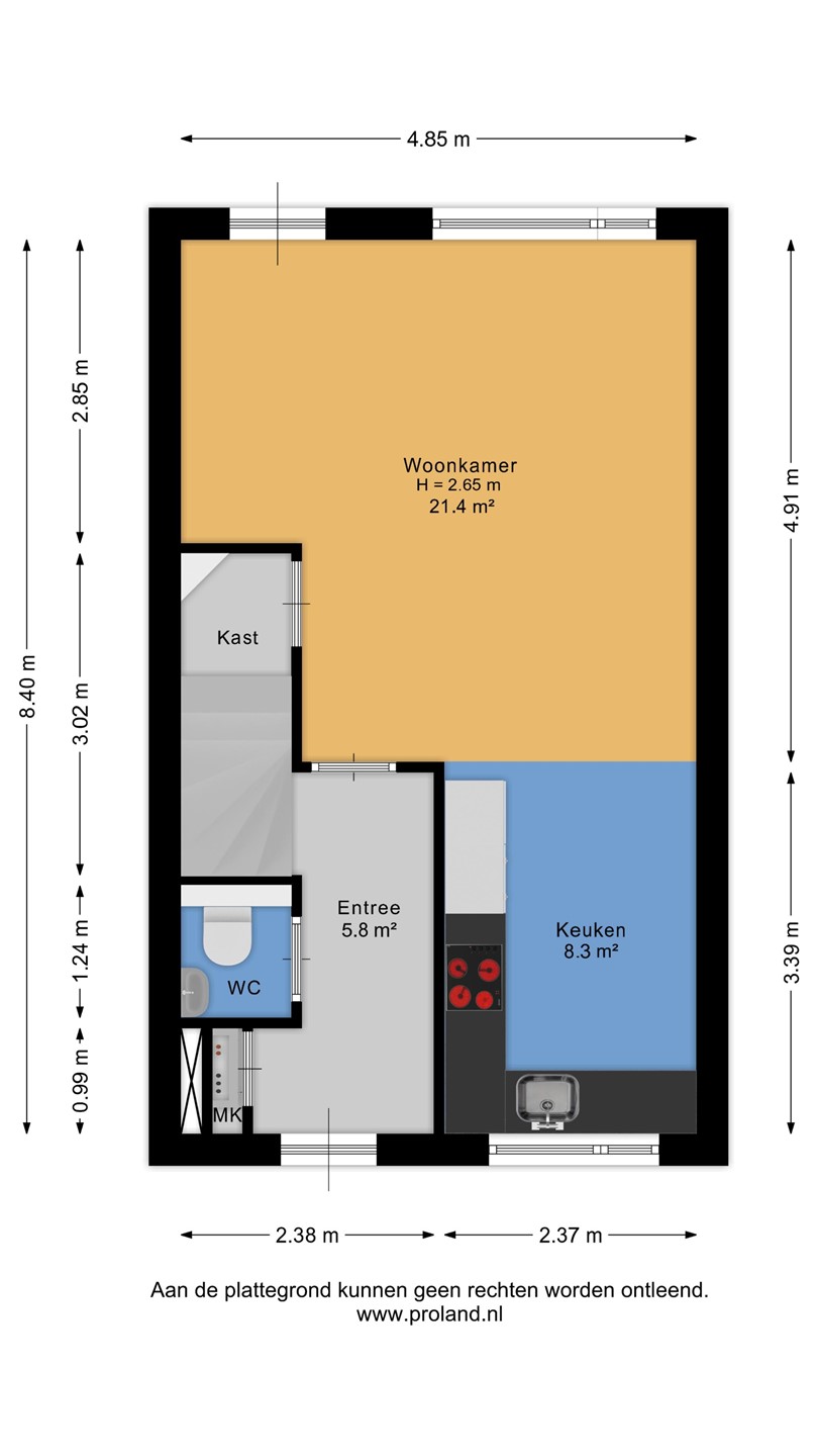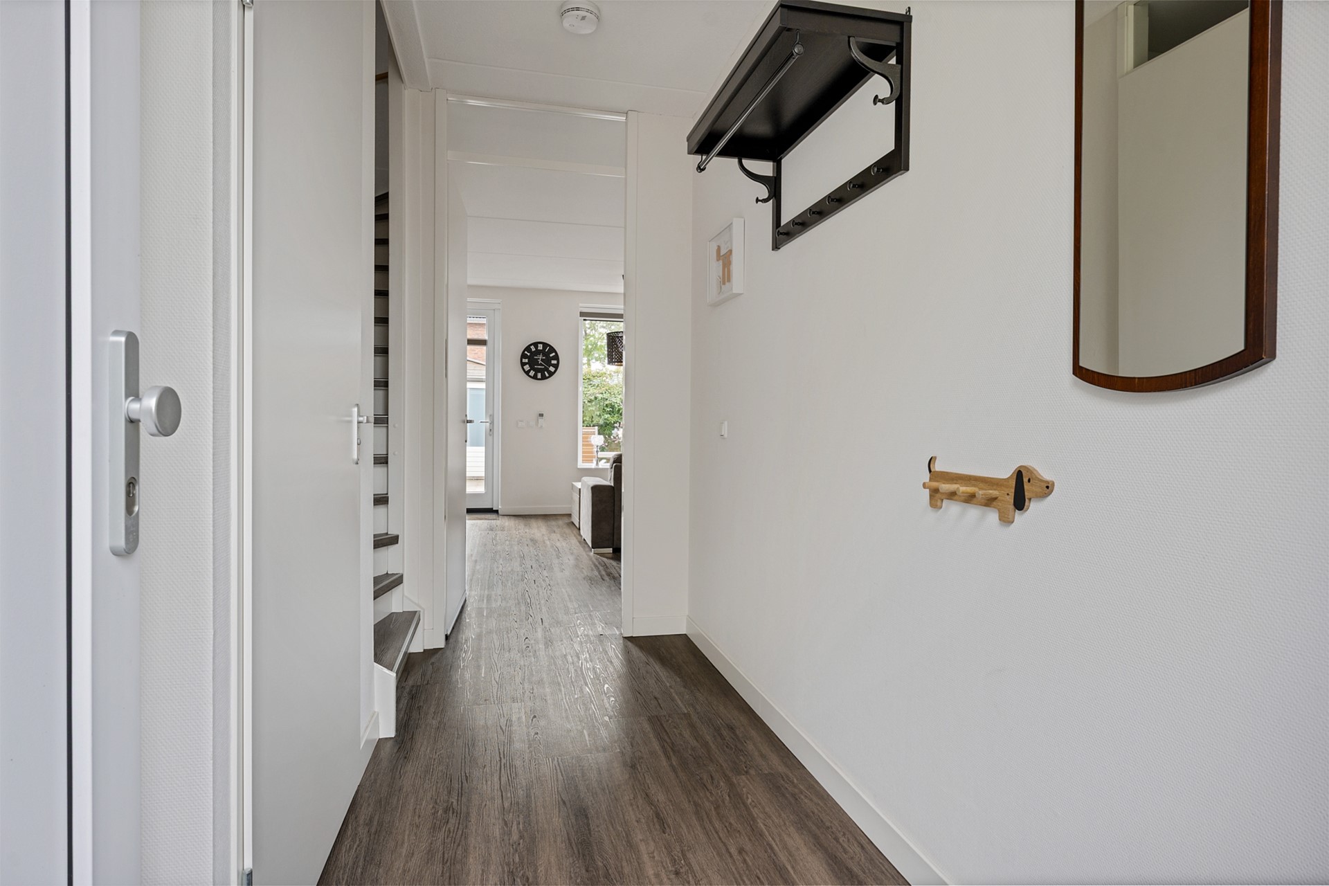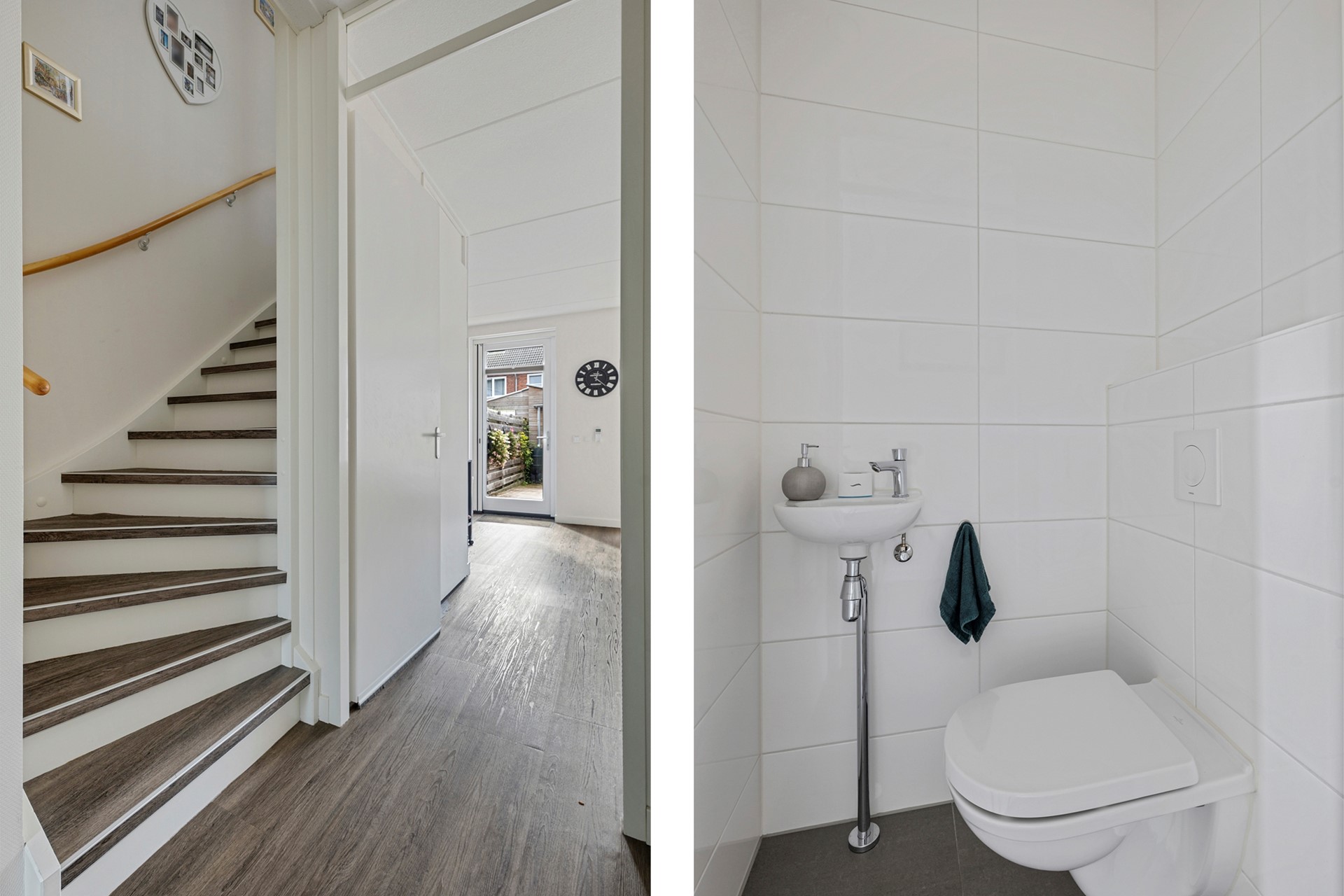 Entree, hal, toilet, trapopgang, woonkamer, open moderne keuken met inbouwapparatuur.