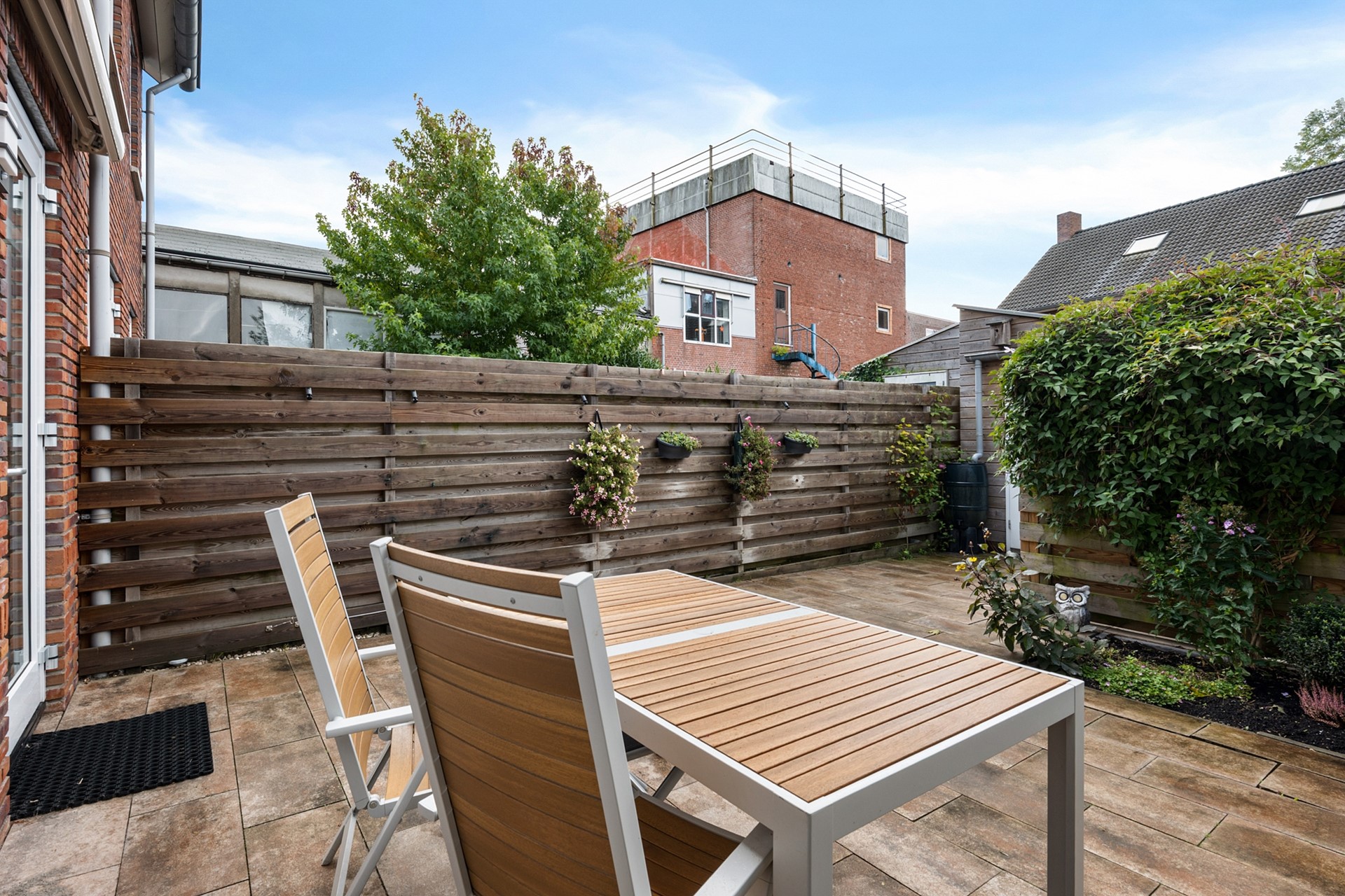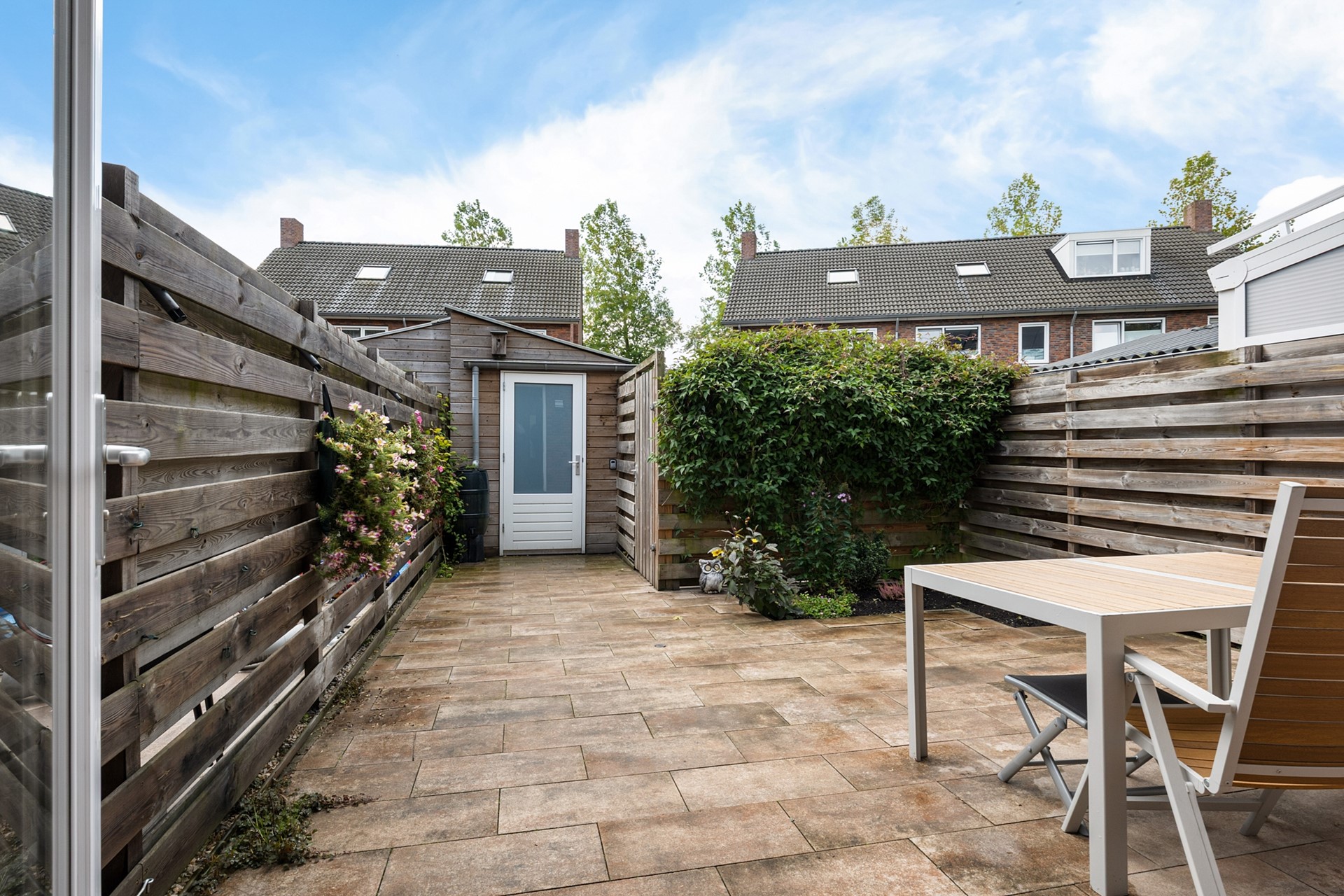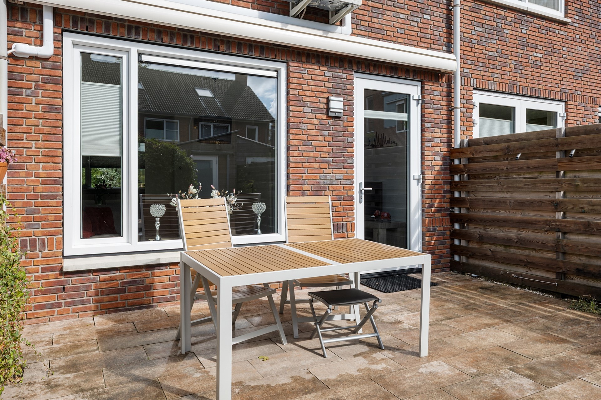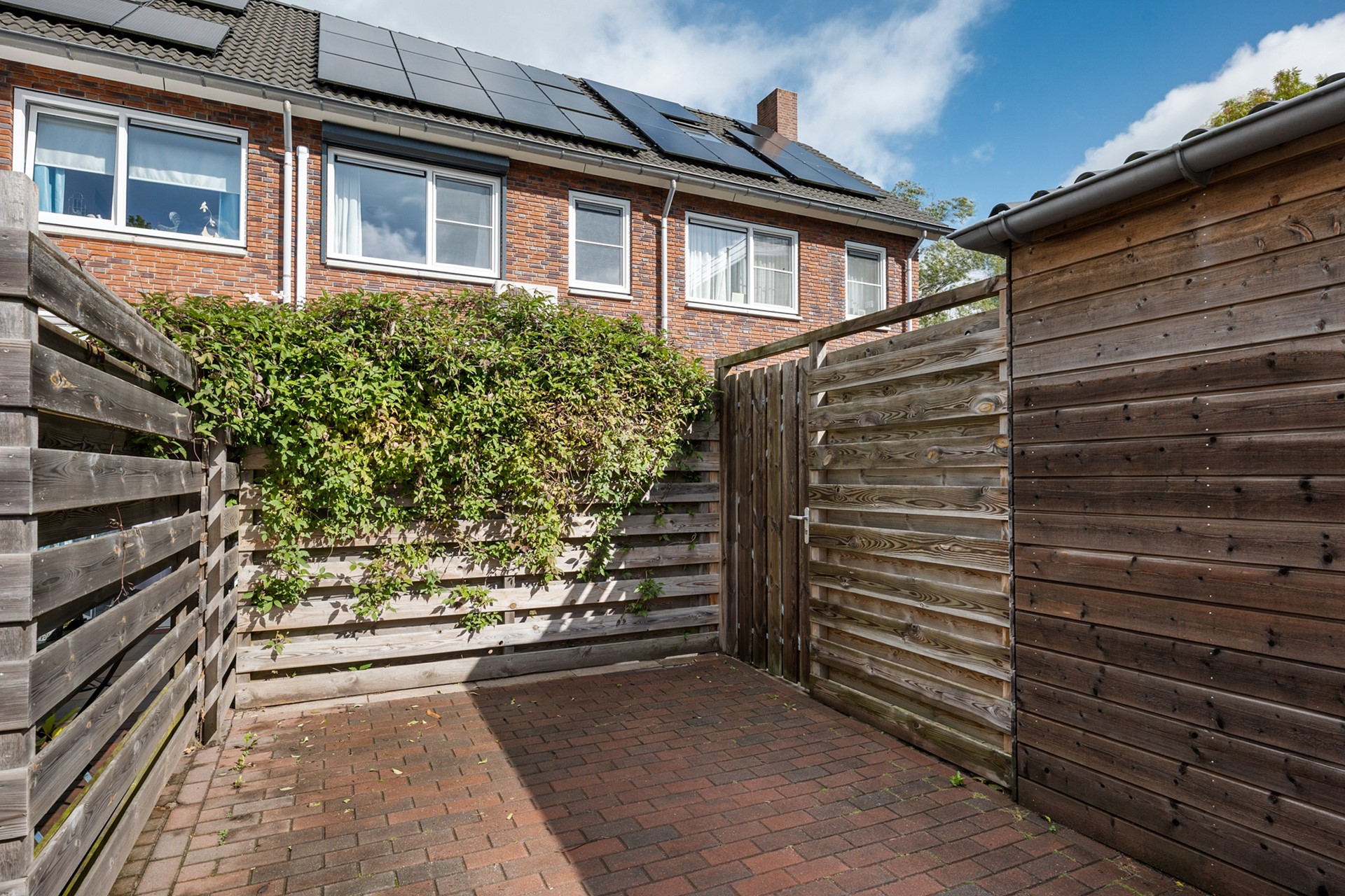 Onderhoudsarme tuin volledig bestraat, gelegen op het zuiden.