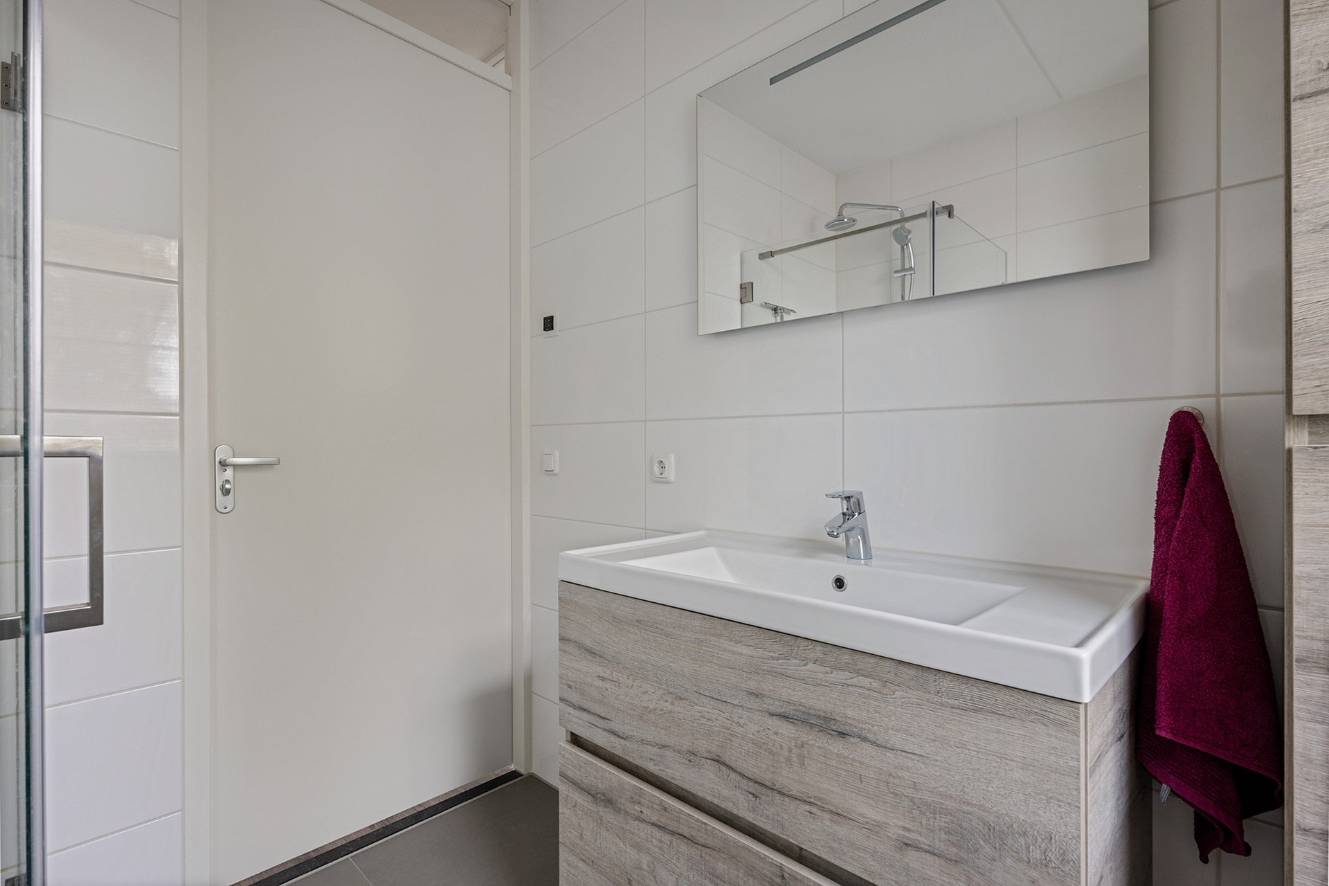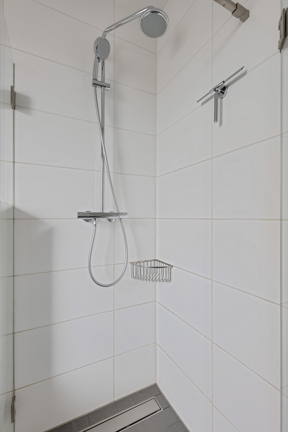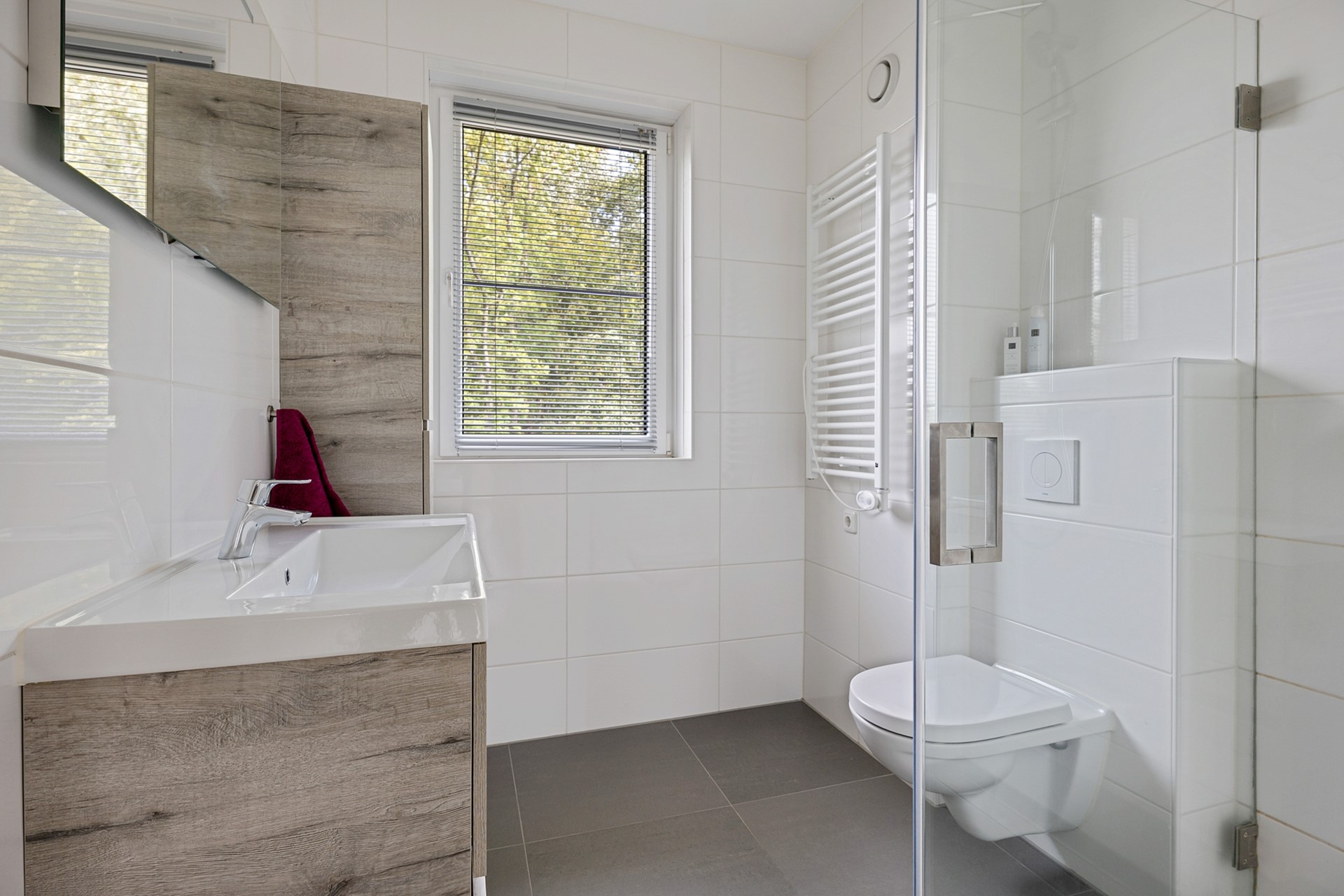 Overloop, drie slaapkamers, badkamer met douche, wastafel meubel en tweede toilet.
