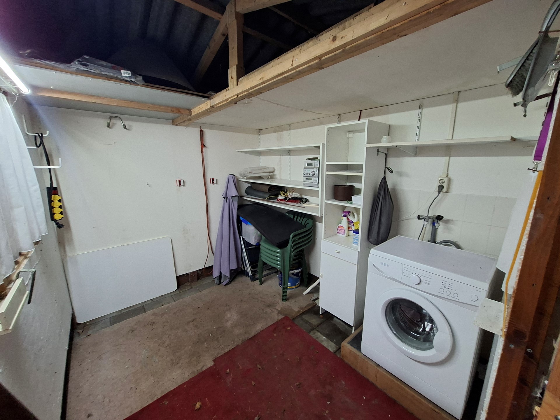 Houten berging met wasmachine aansluiting en een overkapping om heerlijk te kunnen genieten