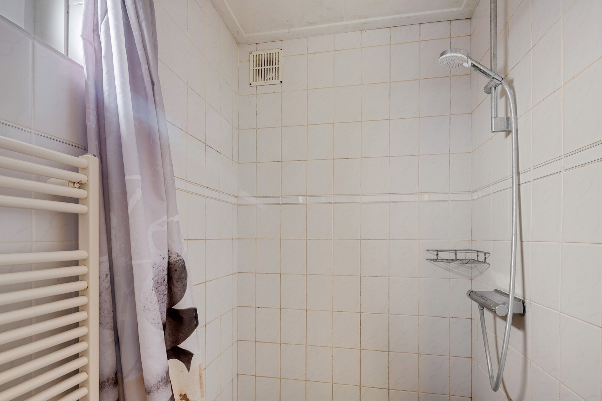 Overloop, drie slaapkamers badkamer met douche en wastafel.