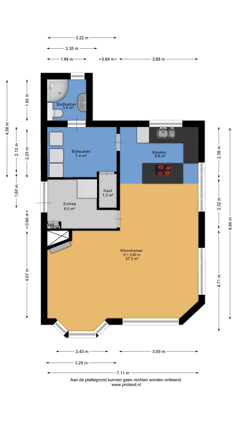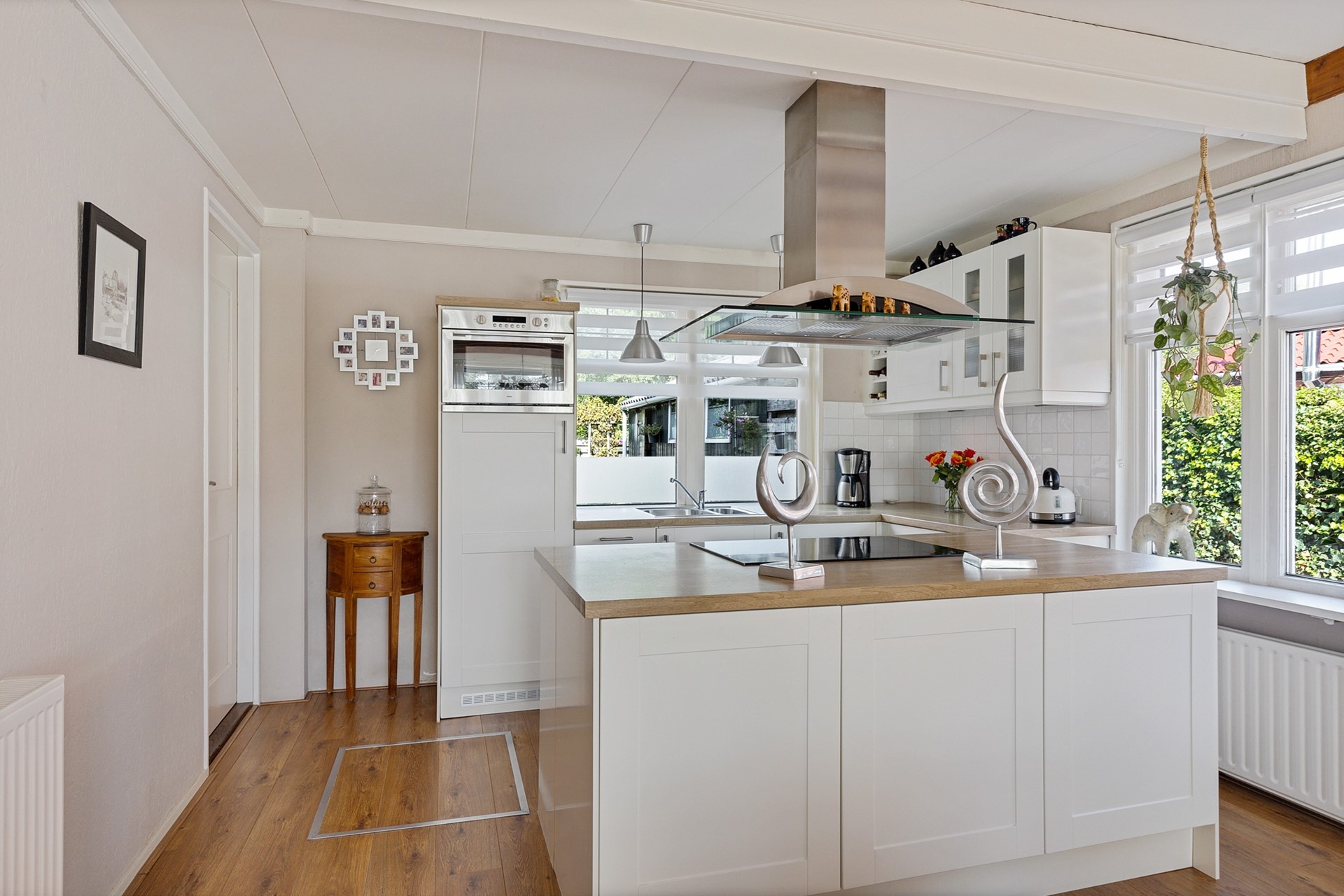 Entree, hal, ruime woonkamer van 37 m2 met een open keuken van 10m2. Via de keuken naar de bijkeuken en badkamer. Via de bijkeuken naar de besloten tuin met berging en garage. De berging is ingericht als kantoor.